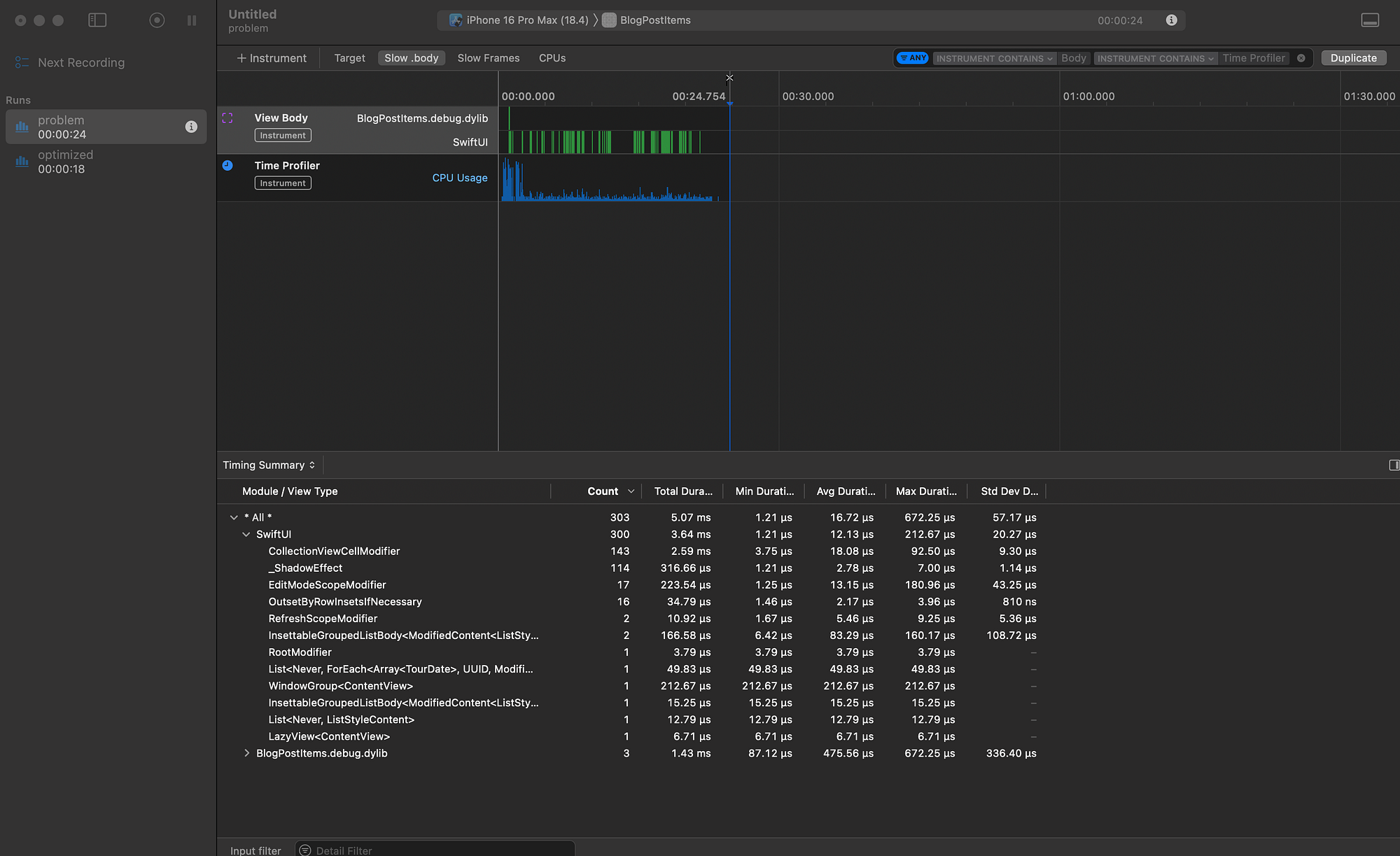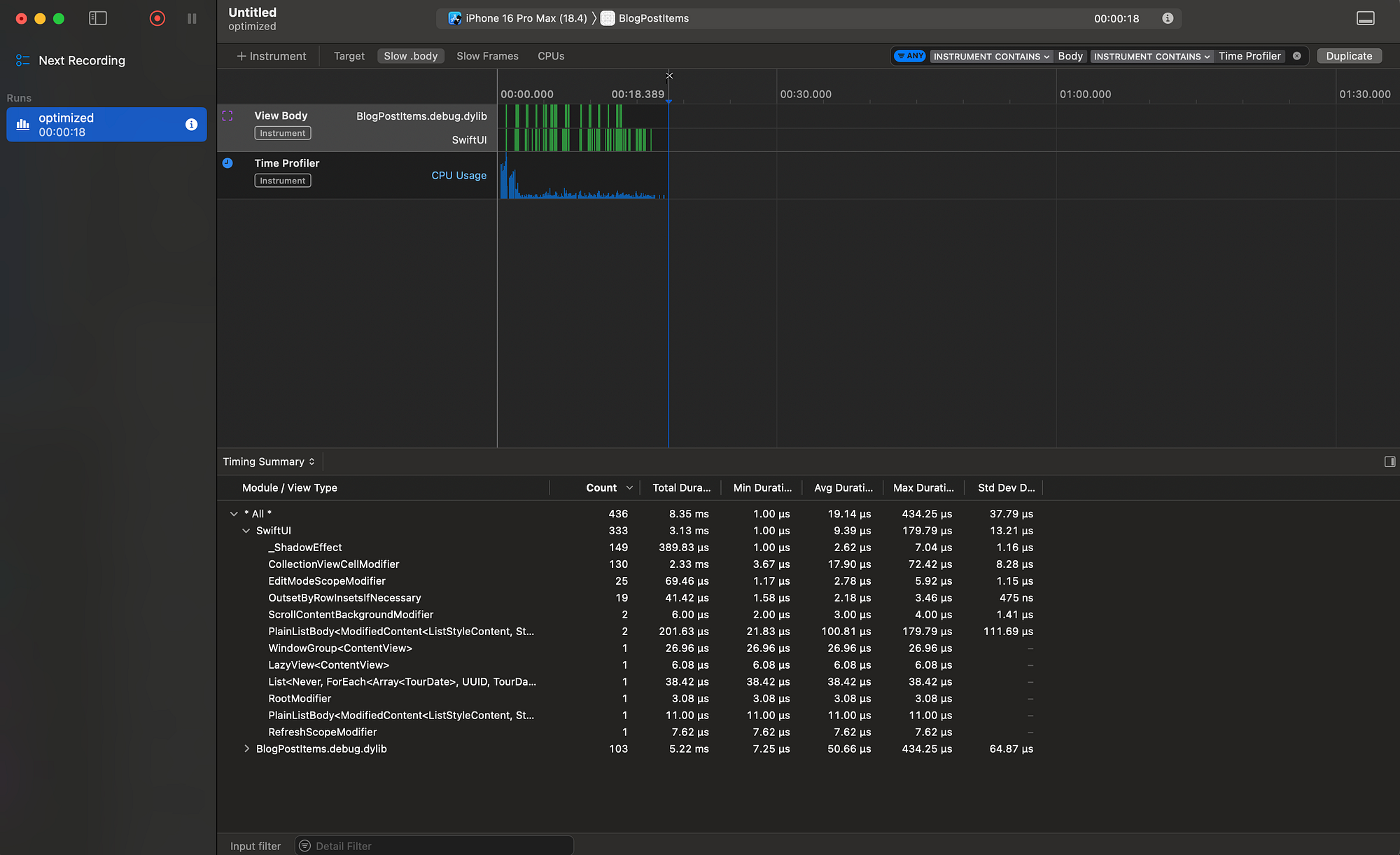 After applying our optimized version, we ran both builds through Instruments to validate the improvements. Here’s a full breakdown of what we uncovered during the analysis: